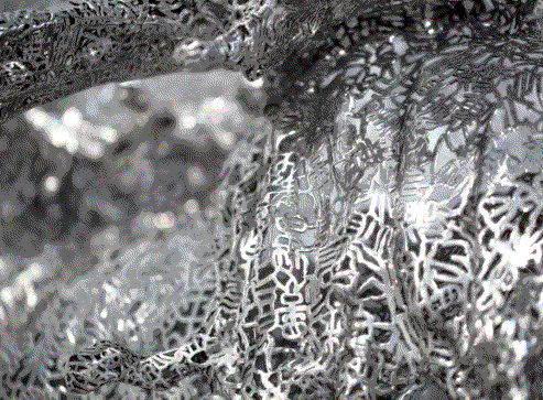 There was still a bit of volume and mess on the surface of the steel when he pierced and cut the board of certain thickness in the early time. In his recent works, however, the large quantity of thin stainless steel board dispelled to its maximum volume and mess of the material. The purpose behind this change in the choice of material is obvious: to present the paradox of "formless form".