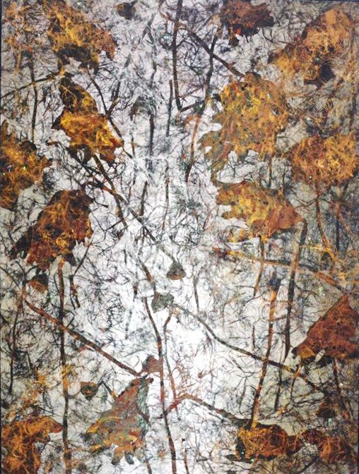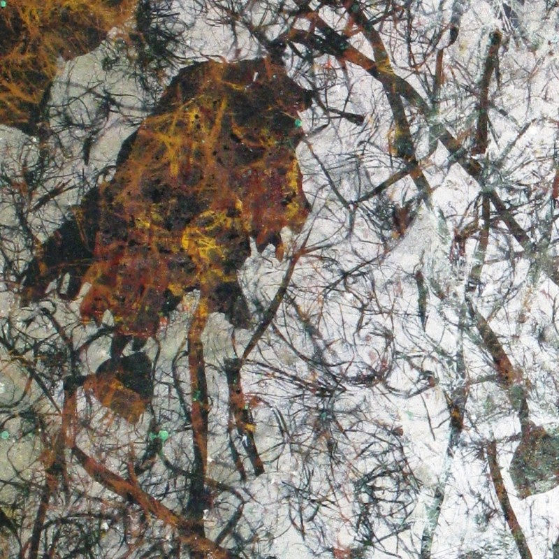 Huang Guanyu paints lotus flowers and seed pods with his unique touch. Unlike many other paintings commonly depicting lush lotus ponds under a moonlit faint-blue sky, Huang utilises this theme to reflect on painting itself by presenting a somewhat different scene - a withering, bleak and deconstructed lotus. Broken stems interweave with withered leaves and seed pods in his work Golden Lotus Pond 2. Huang's work toes the line between abstract and figurative aesthetics; the layered composition itself is evocative if not naturalistic. He strengthens the pictorial flatness and composition of the painting, instead of using an objective and realistic way of expression. Huang does not dedicate much of the canvas to any naturalistic details, while the lotus remains firmly recognisable in the composition.