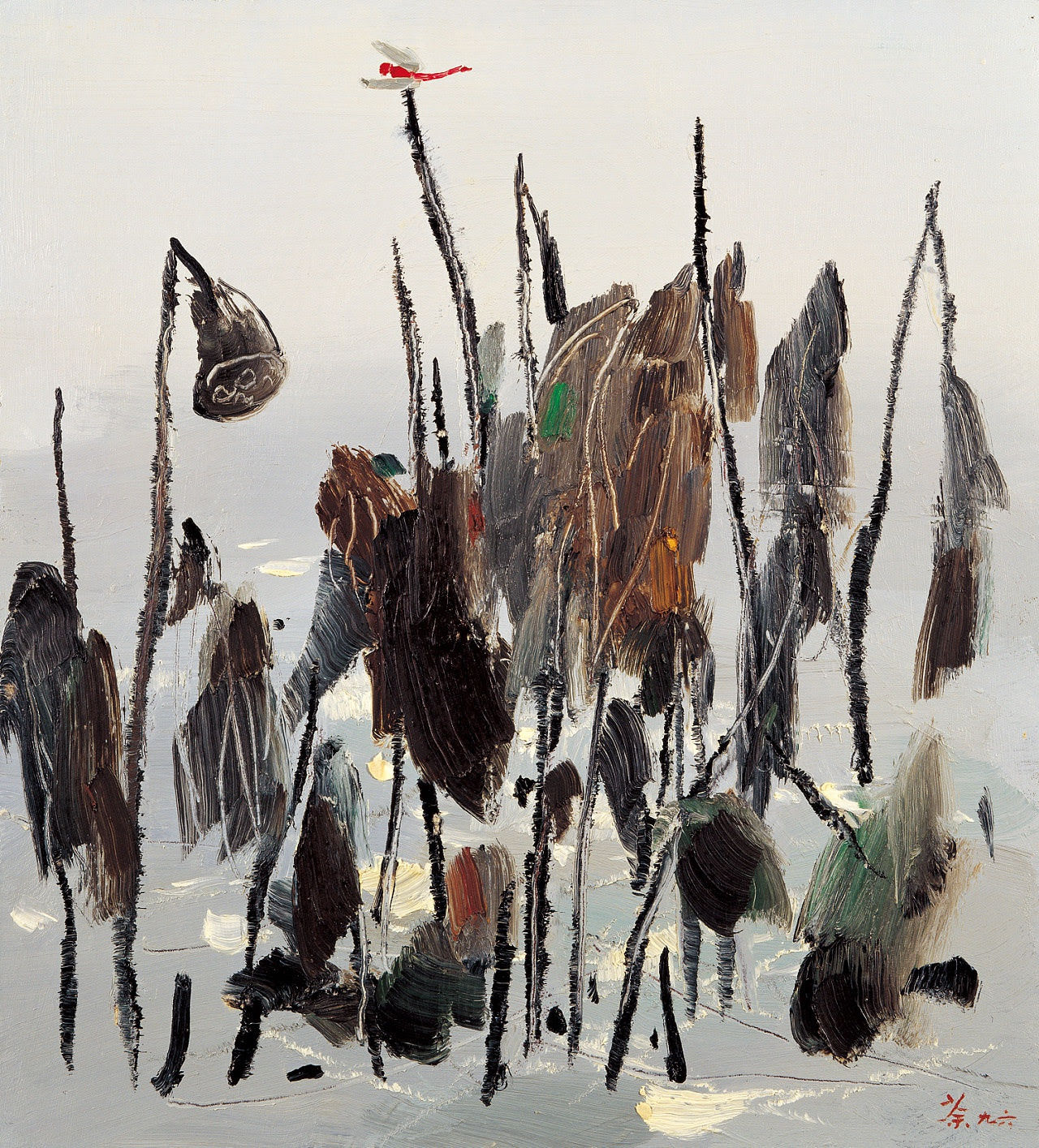 As an eternal imagery in Chinese painting, the lotus is rendered in a somewhat different style in Wu Guanzhong’s Red Dragonfly. Compared to Huang’s bleak lotus, Wu’s lotus pond is surrounded by the casting of interweaving shadows between the layered leaves. Destroyed by freezing snow and frost, the lotus becomes withered. A red dragonfly in the centre standing on the tip of the leaf, is a traditional symbol representing an artist’s life experience and spirit.