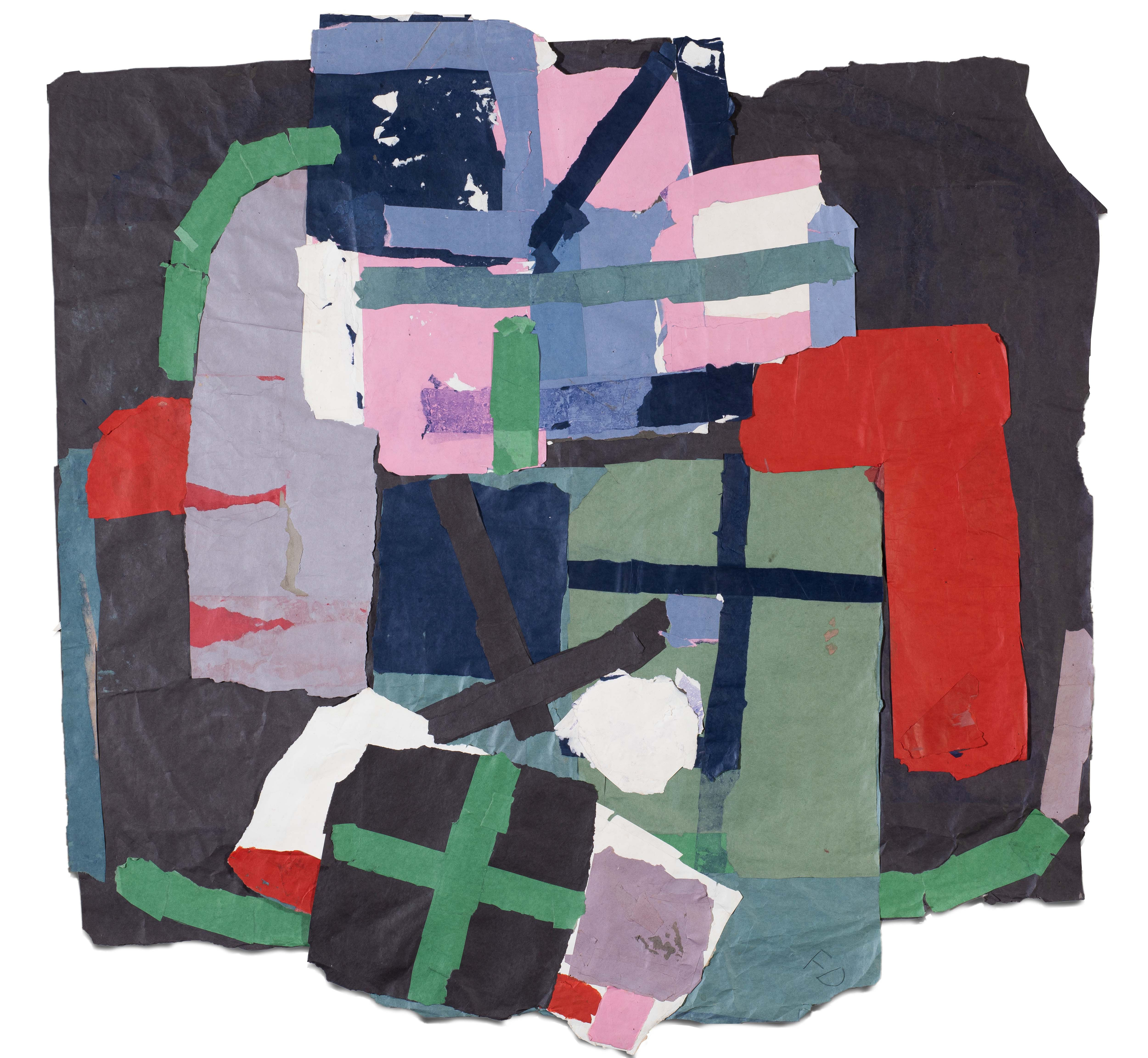 Francis Davison was a pre-eminent British abstract artist practicing in the second half of the 20th century. After World War II, Davison relocated to St Ives and was introduced by Heron to Margaret Mellis, who became his partner after an extended period of tentative friendship. After 1950, having been influenced by the distinctive style of many 'St Ives’artists, he gave up painting and started making collages, developing his iconic artistic style. ‘Navy, Red Blue Pink Green’ is a striking example of his collage works. Collage originated from the creative methods of Pablo Picasso and George Braque in the Cubism period and through the use of ready-made objects — newspapers, photographs, coloured paper and other available items glued together on paper or canvas. Davison developed his extraordinary language of large collage in the 1950s, building structures, divisions and edges mainly using torn colored paper strips. In ‘Navy, Red Blue Pink Green’, the thin, light structure of the coloured paper allows the artist to divide the canvas into simplified elements of abstract language. The unrestricted overlapping of lines, polylines, and crosses that appear repeatedly in the collages, create a sense of multiple spaces and the artist’s rational design and composition.