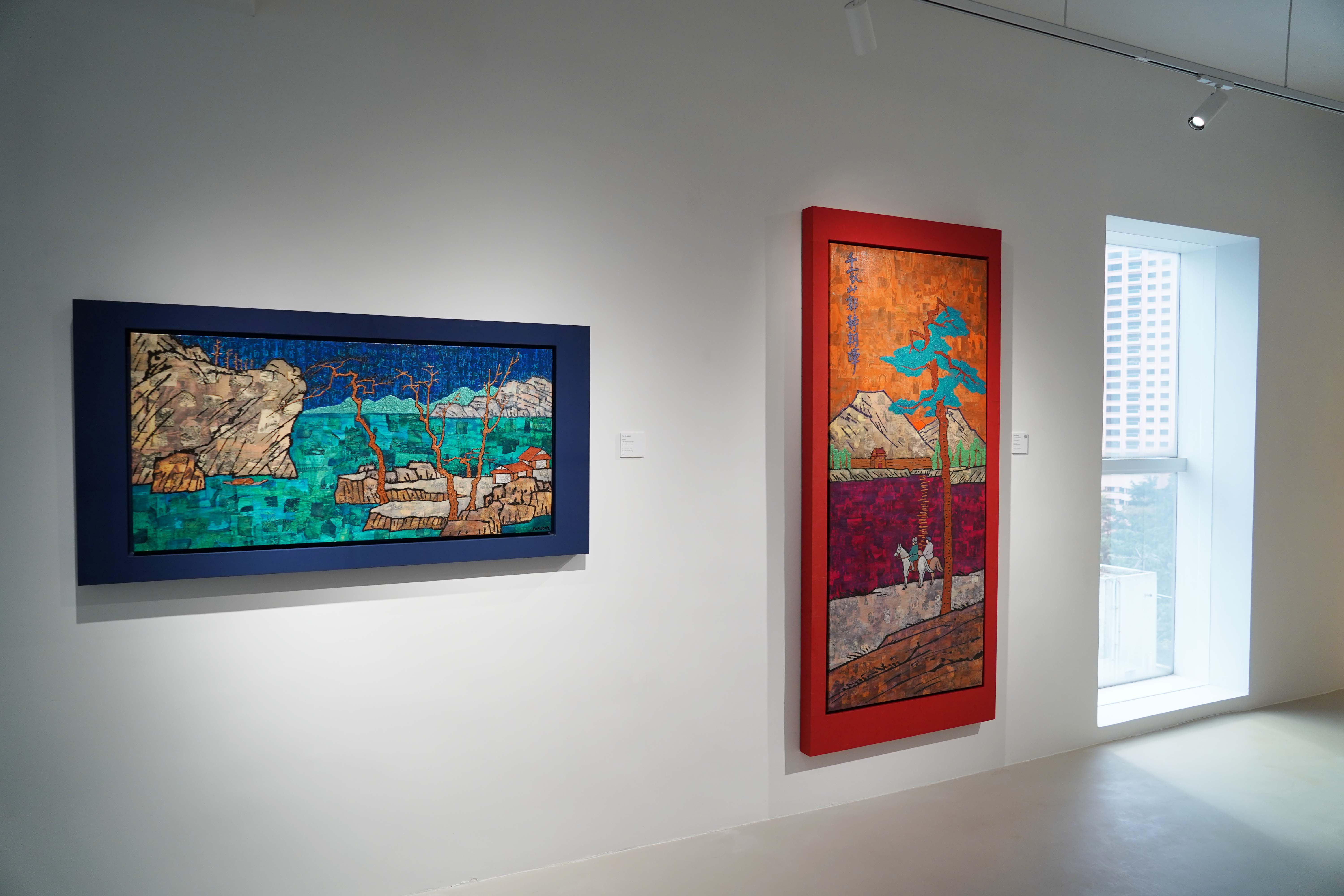 Right: Xue Song, The Silent Morning in Autumn - Feng Zikai's Poetry, Mixed media on canvas, 2018, 180 x 80cm