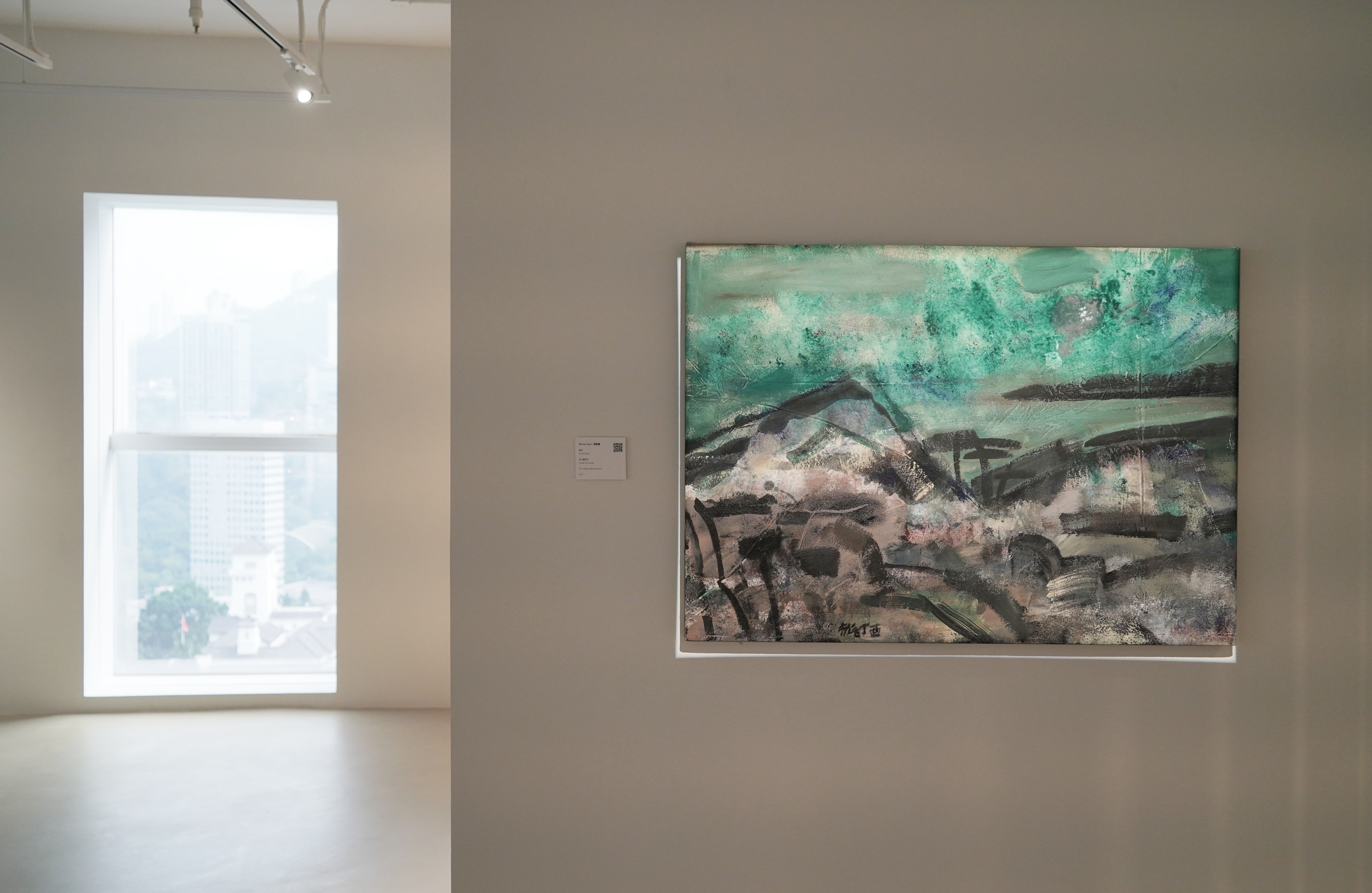 Throughout his practice, Wang Jieyin has utilised the creative techniques of printmaking, oil painting and ink painting and carried out experiments in Chinese abstraction. In Green Skies, we can see traces of pigments, multiple layers built over time. The artist adopts a horizontal composition and emphasizes ‘spirituality’ over shape or form whilst the tranquil landscape and the green sky are outlined with a silhouette. The artist applies large areas of matte acrylic and although dominated by green tones, the painting exudes feelings of ink art, echoing ancient literati paintings, and conveying a simple and romantic passion for life.