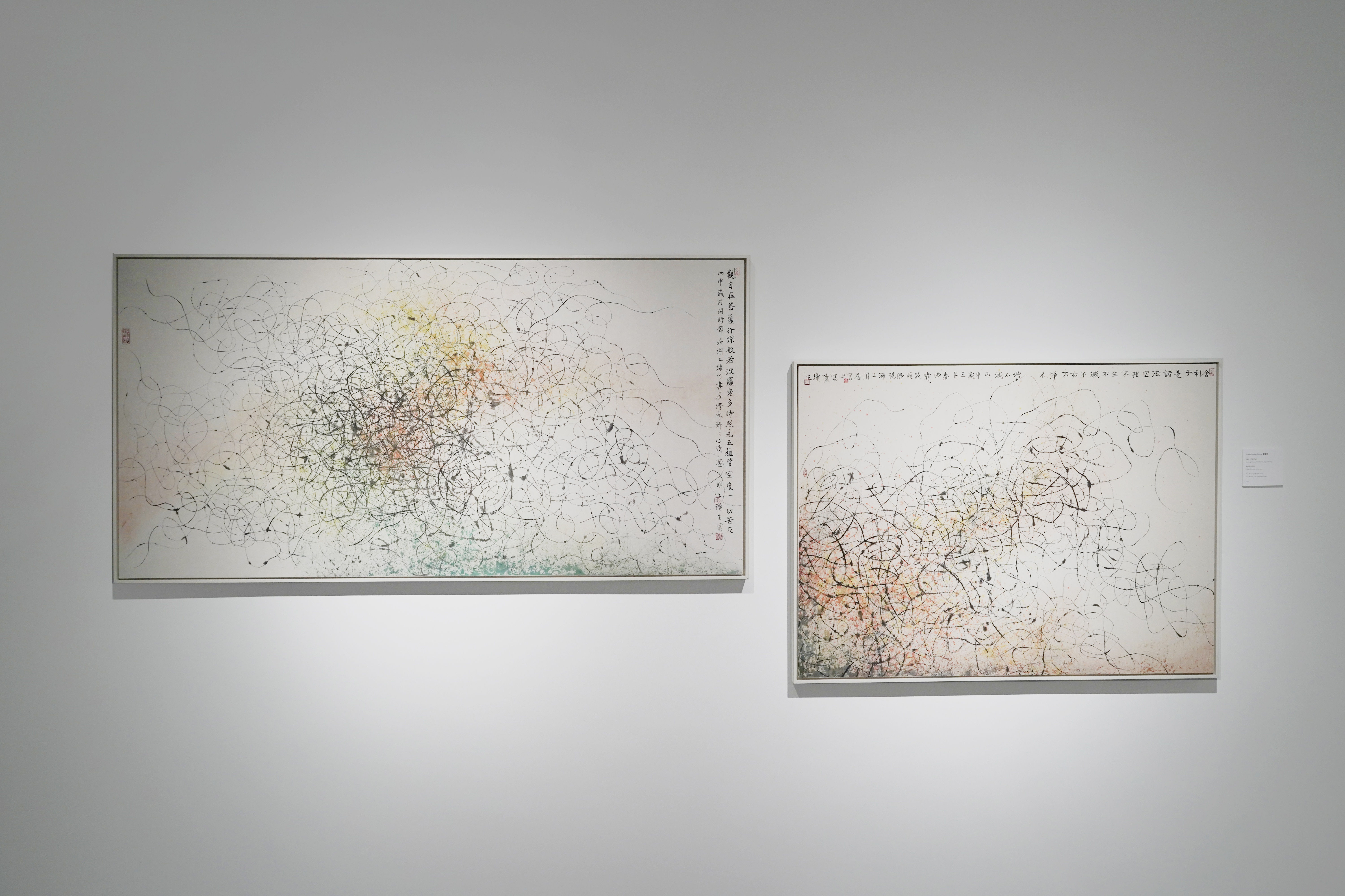 Moving Vision: Avalokiteśvara was created by Wang Huangsheng whilst he was living on a lake during the Spring blooming season. Wanting to express the practice of Vipassanā meditation, the artist tempered the exquisite lines of Chinese painting and traditional calligraphy into his own abstract language. The free, undulating lines of ink create uninterrupted spatial movement, combining fortuity and spontaneity with primitive forces and the artist’s deepunderstanding of Tao and Ch’an. The red, orange, yellow, and green hues convey the joy of the four seasons, and the composition, colours, and the unpredictable, continuous ink lines confirm the artist's consciousness of living within the wisdom of the Tao.