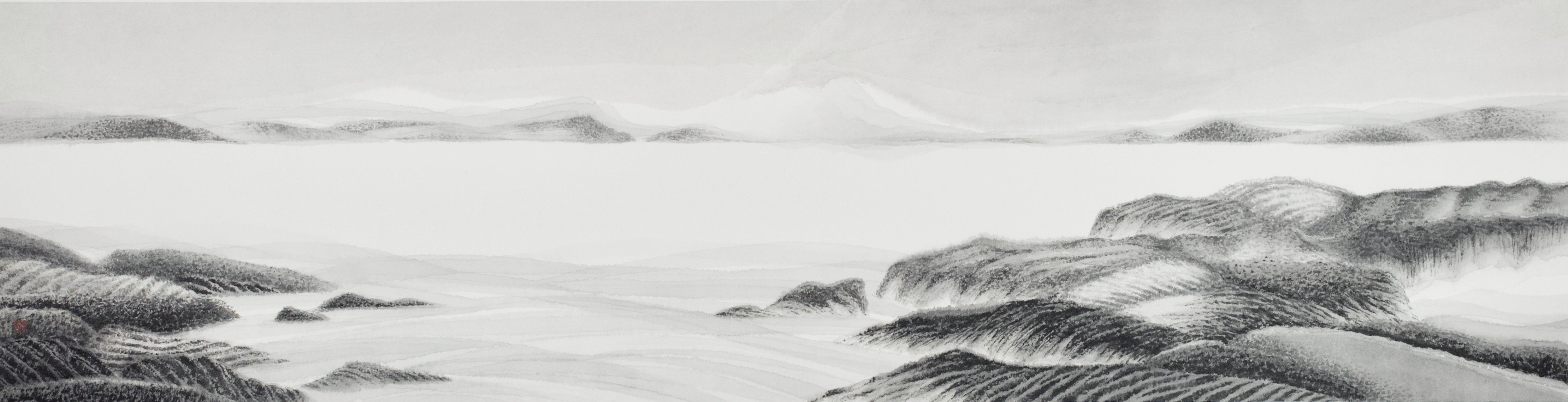 Kassia’s fondness for Hong Kong’s city and landscapes is depicted in her painting. In Tracking Light Series #11, the artist depicts mountains and landscapes. The bands of ink capture the momentary feeling of satin-like light and shadow Ko experienced whilst sketching, alongside horizontal spatial depictions of landscape. Undulating mountains and the deliberate choice to leave ‘white space’ make the paintings a wonderland. The subtle ink dots resemble raindrops and the textured, hemp-fiber strokes express the misty colours of the plains and mountains. These raindrops and textured strokes have an implicit "Mi Fu" style that highlights the inner spirit of nature and landscape.