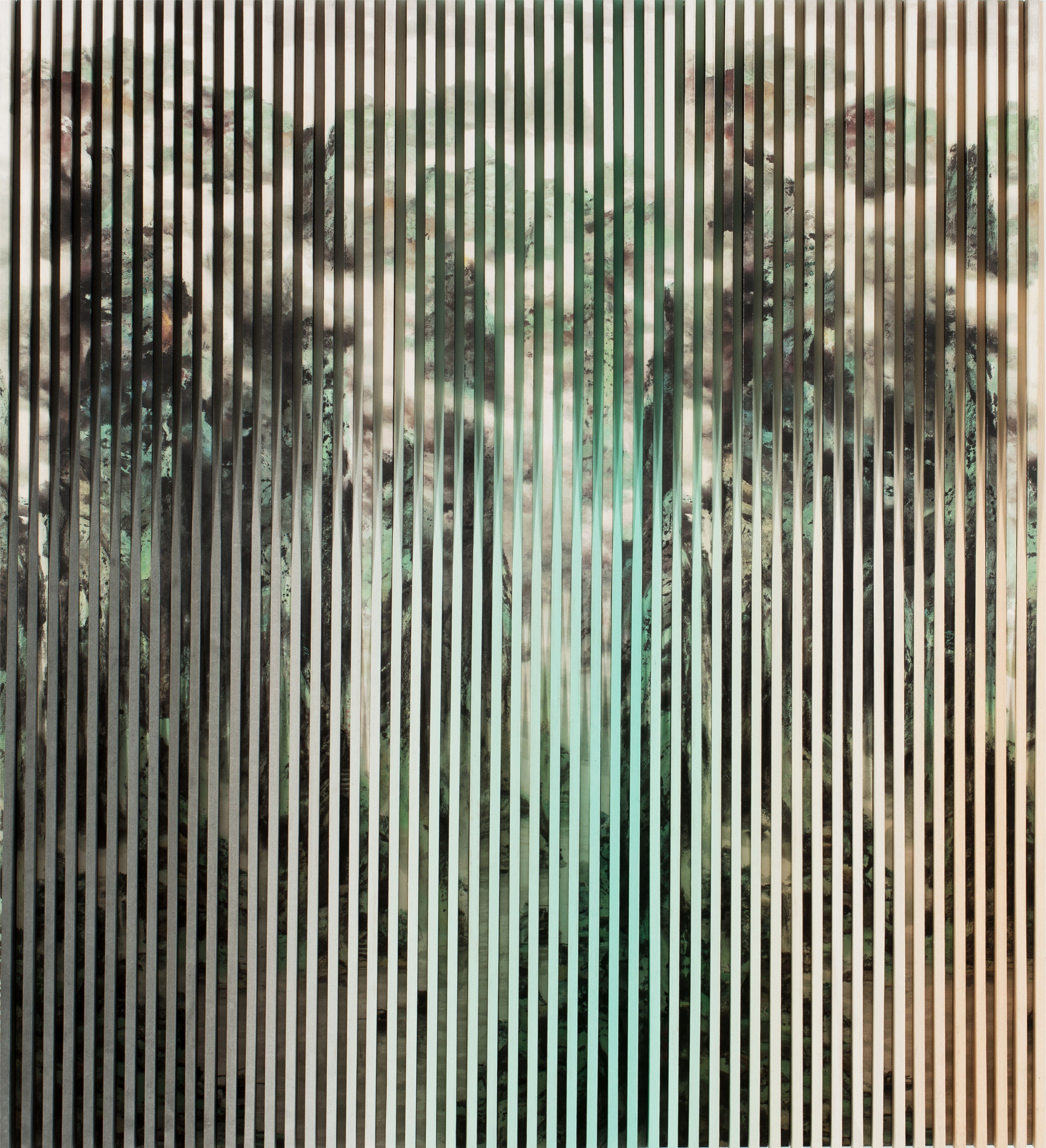 Yu Yang is a Chinese contemporary artist and a co-founder of the avant garde art group COLD INK. The mixed media painting installation Ink Object - Green Gradient is a reinterpretation of Gao Zongyuan’s The Blue and Green Landscape. Echoing the mountains, clouds, water and fog in Gao’s landscape painting, Yu composes his works by organising and layering painted wooden strips, adding a physical space onto two-dimensional canvas that constructs depth and optical illusion. Reconstructing and renewing landscape scenery is commonly seen in Chinese architectural discipline. It resonates to the presence of real and unreal in Chinese abstraction, and the realms of heaven and earth.