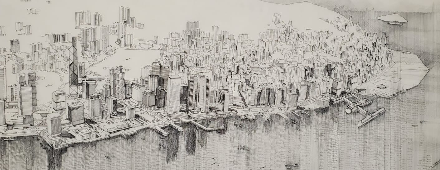 In this retrospective exhibition of the distinguished architect and artist Professor Raymond Fung marking seven decades of his life, a wide range of works are brought together for the first time tracing his evolution as an artist since the 1980s. At the age of 9, Fung first sketched his home city, Hong Kong. This early line-drawing [FIG 1] shows a meticulous attention to detail in his careful tracing of the city, indicating the artist’s early architectural instinct and sense of place.