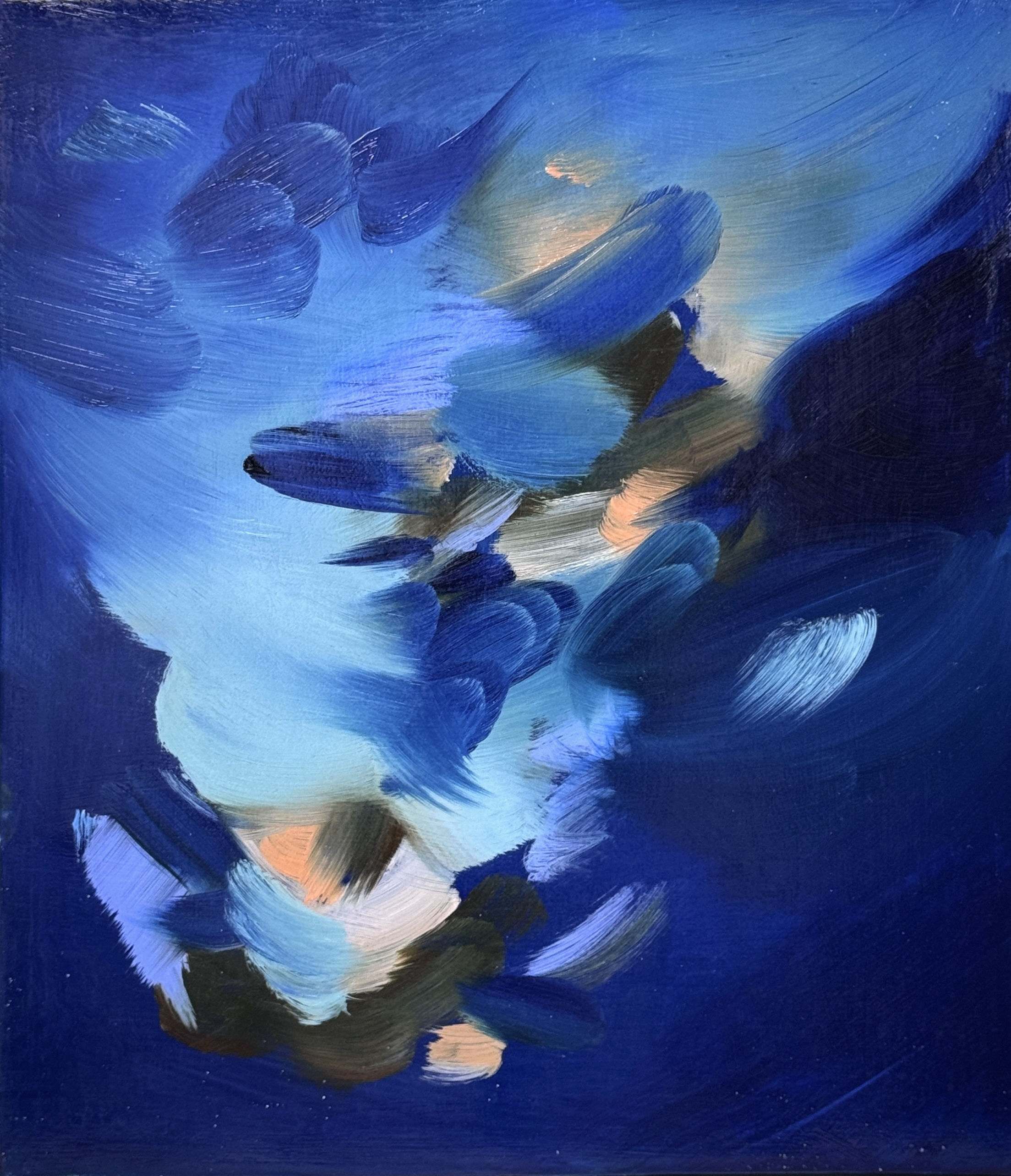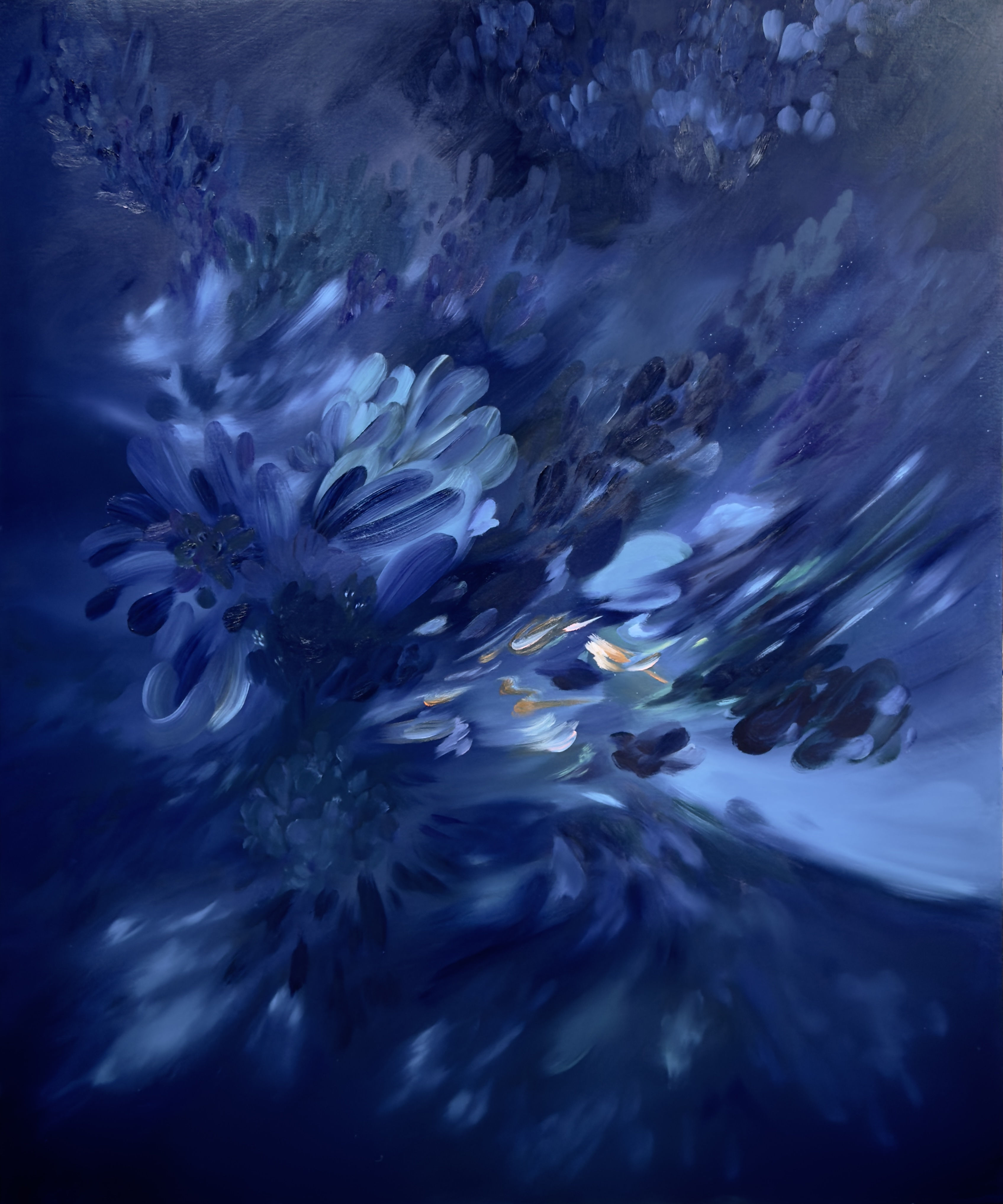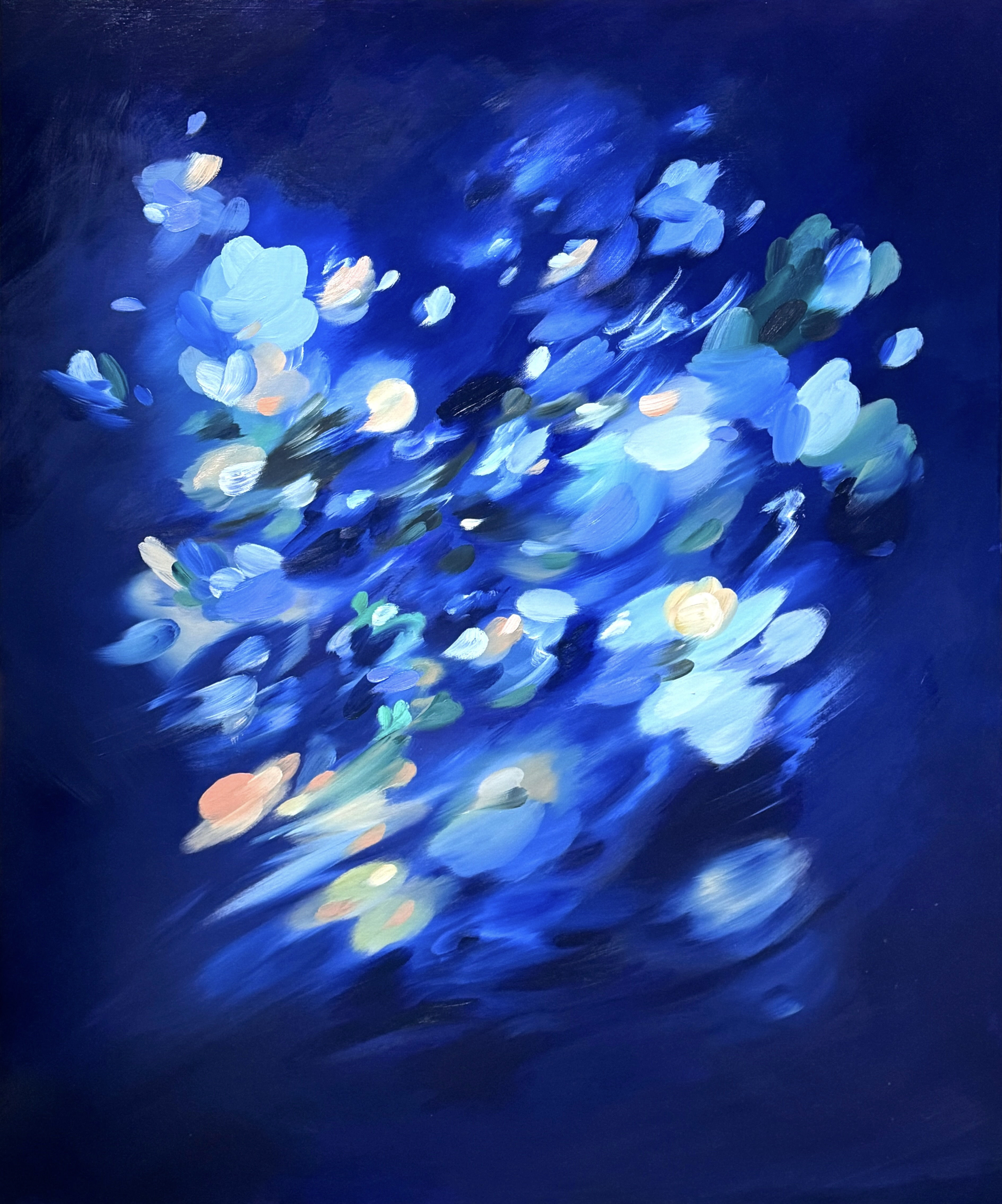 As I worked on this series, I pondered on my usage of deep blue. The process of creating these deep-blue paintings allowed me to engage with my own feelings of grief and mourning, or perhaps to reflect on where the departed might have moved on to. While at times, I felt inclined to introduce more colour to my pieces, I find myself constantly reverting to a muted and dark colour scheme. Knowing that there were moments when the sky seemed to be shifting in my work, I had already envisioned that this deep blue could hold potential for the emergence of light through colour. However, at that point, I felt that the usage of dark, muted colours was essential for me personally to sediment and to mourn in a quieter, more contemplative manner.
