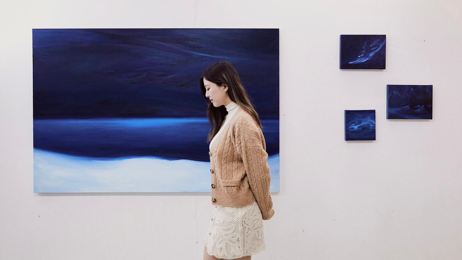 Joanne Chan and her paintings, from left: On the way - Blue Horizon, On the way - Blue Soul, On the way - Blue Current and On the way - Blue Desert, 2021