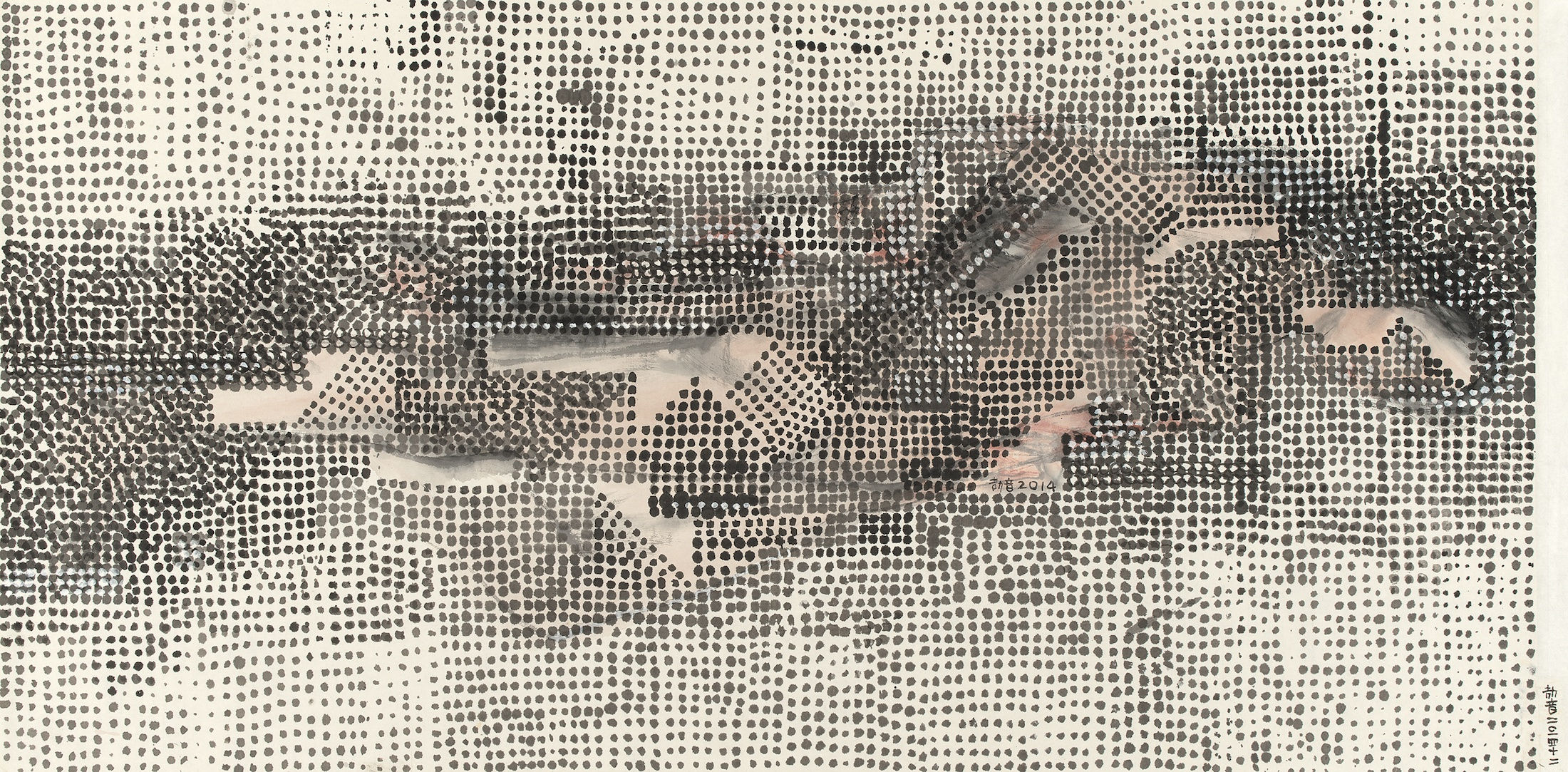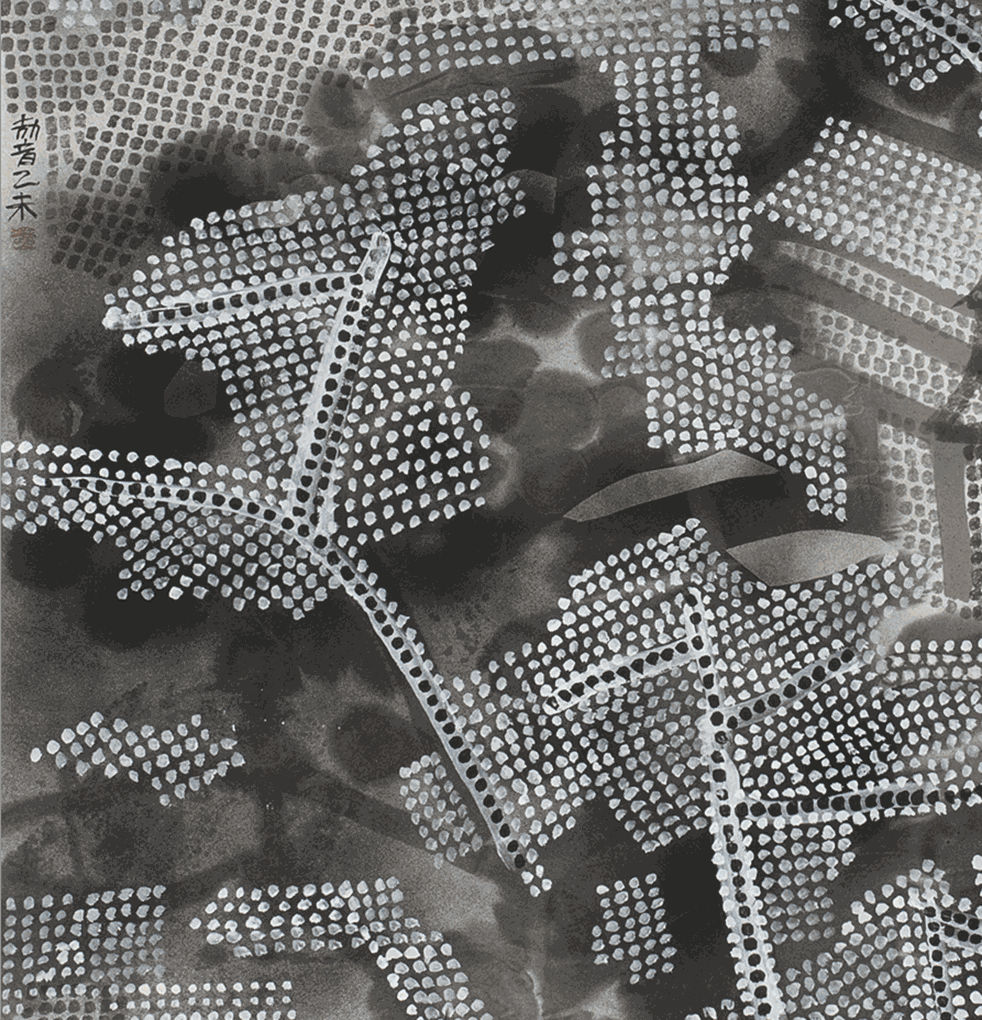 Already in his early printmaking days, Wang Jieyin was creating shanshui and nature as he understood them. He continued with individual creation of modern oil paintings and shanshui sketches with ink and gigantic works with folded spaces. From flowers with the antique charm of the Dunhuang murals to acrylic oil series of grand landscapes, and grand ink landscapes with quaint, desolate state and hallucinatory vision, he established his individual language or “original language” step by step. The basic original language of Wang Jieyin’s painting is formally simplified writing and rhythm-making, the mural texture and lofty quaintness of palette, the abstract dots composing original language and the fantastic folded space. The sense of writing and abstractness are combined into infra- image painting.