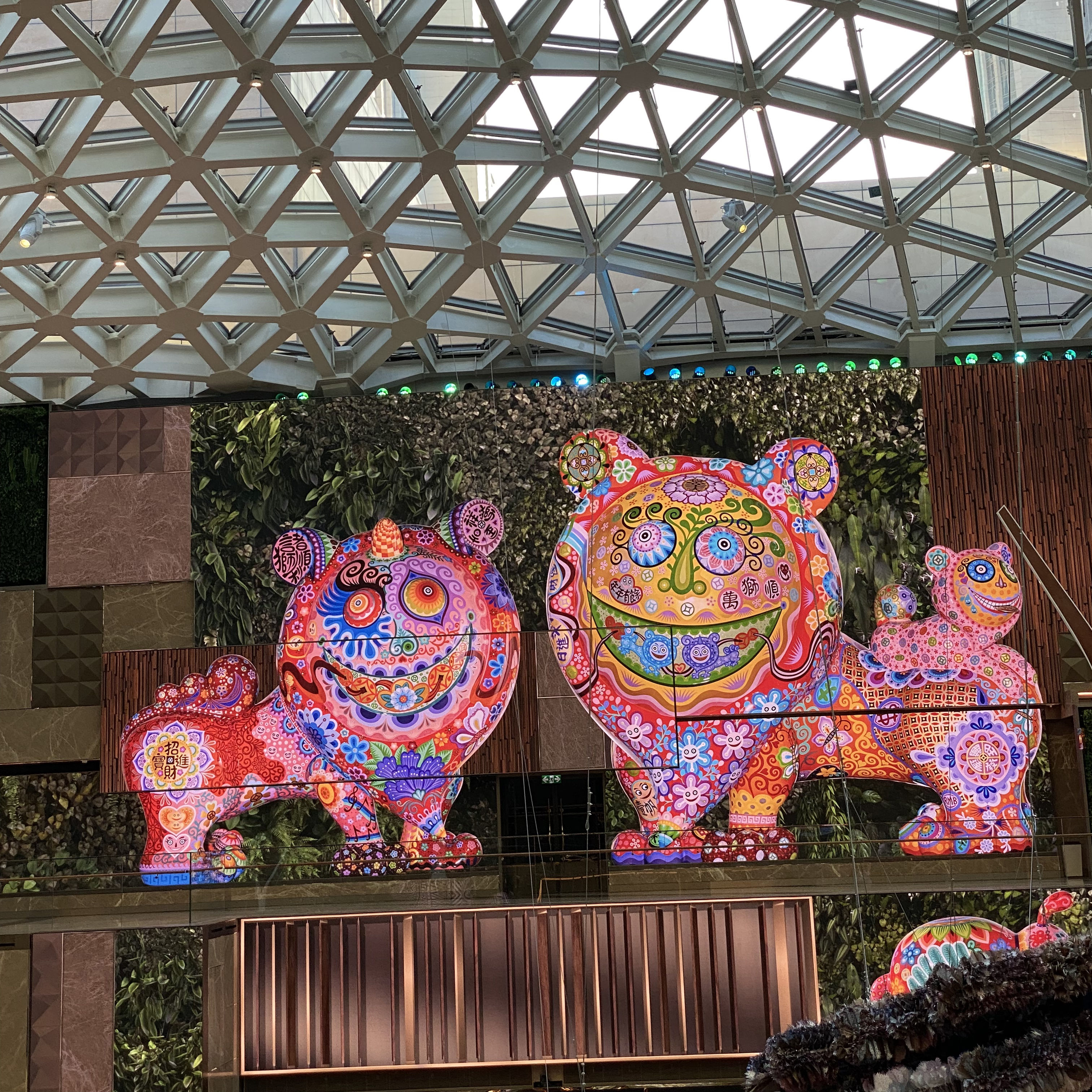 The central figures in the “MGM Lion Party,” Mr and Mrs Lion, are something of the protector figure. Since ancient times, the lion has been seen as an auspicious keeper of peace and protector of wealth. This regal lion greets visitors with a wide grin, coins held in its mouth to attract wealth, and coins on its paws, symbols meant to ward off evil and bring good business. It stands in a strong, steady stance, energy waiting to burst forth, with an auspicious cloud (its tail) by its side. Copper coins and silver bells ring out sharply with the flicks of its ears. The lion mother has a smile on her face, her eyes filled with love, and her heart with compassion, symbolizing motherly love. A lion cub sits behind her with an air of mischief, coins clutched in its mouth, innocent and without a care in the world. The lion father stands on a golden ingot, controlling the family fortune, while clutching a drinking gourd, a symbol of familial fortune and rectitude, protecting the family's happiness.