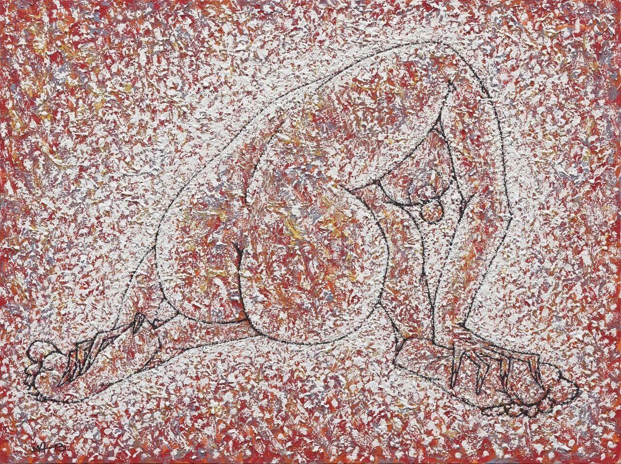在《情繫大地》(2003)中,裸體形象幾乎在畫面中完全消解,與厚重顏料融為一種抽象的模糊。畫作通過粗獷的厚塗技法呈現,線條如同塗鴉般在畫布上來回穿梭。這張作品散發出強烈的能量,狂熱地詮釋了標題所寓意的「身體與背景的歸一」,生命與形態被整合為我們世界的基本法則,能量、生命與大地渾然一體。